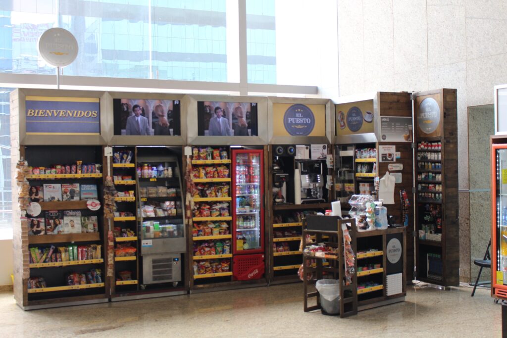 alimentos, bebidas, botanas, sándwiches, revistas, tabacos, dulces, chicles y pastillas, comida lista para calendar, café, refrescos y jugos, recargas telefónicas, accesorios para teléfonos celulares.